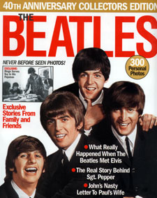 local Hannaford's grocery store. The publisher's, y'see, happen to be the Florida-based supermarket tabloid specialists, American Media Inc., and that's perhaps the first hint that the 152 pages included between the covers of this oversized (10 3/4" X 9"), square-bound, slick-paper commemorative cash-in is unlikely to rival the Fab-focused specials meticulously assembled by Britain's "Q", "Mojo", or "Uncut" monthlies in recent years and beneficently shipped across the ocean for sale in some of our finer book-selling emporiums. But NOT in food stores. Nope. That's American Media's domain. Which might lead some of you more discriminating Beatle Geeks to reflexively turn up your nose and smugly assume this magazine to be essentially worthless. |  |
