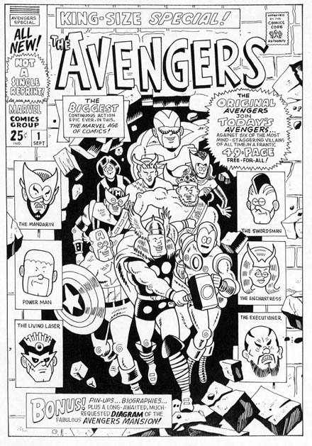 Considering that they apparently seem to be demolishing a wall of their posh Manhattan mansion, that's one happy looking bunch of super-heroes!?! Of course, what they're not showing you is poor beleaguered butler Jarvis, standing forlornly in the background, broom and dustpan in hand, thinking to himself "Not the wall again?! Don't they realize sweeping up rubble is bad for my back?!?..." But there's no denying the exuberance of this particular group of Avengers--Thor, Iron Man, Captain America, Hercules, Hawkeye, the Scarlet Witch, Quicksilver, Goliath, and the Wasp, for those of you not in the know--the question is what's the cause of their unusually sunny mood? The prospect of their very first giant-sized edition, perhaps? |