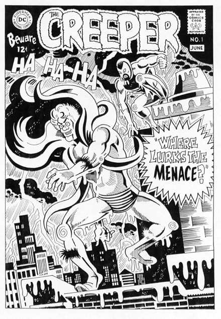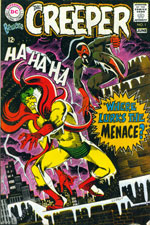After turning his back on Marvel Comics in 1966, Spider-Man's co-creator took on work at ACG, Dell, Warren, and an extended, critically lauded stint at Charlton Comics before finally moving over to the OTHER Goliath in the biz, DC Comics. Steve Ditko's newest creation was clearly intended to leave as big an impression on the reading public as Peter Parker's alter ego had just a few years earlier. A quick glimpse'll tell you Mr. D had the makings of a contender on his drawing board. Look at that get up! Unforgettable! The name? Evocative--can't get it out of my head! That maniacal smile and evilly tinged cackle? Oh yeah, buddy--memorable! The Creeper had all the goods to be a big time superstar, definitely! Except...I, um, have no actual memory of any of the STORIES the Clown Prince of Confusion starred in!?!.. Admittedly, there were only a handful, but the Spider-Man stories--even some of the Charlton and Warren jobs--THOSE I have vivid recollections of. Not the Creeper. |