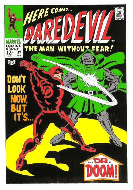 versa! And folks, THAT'S when the fun begins! This rare, late sixties crossover was covered in far greater detail in the essay accompanying my version of the FANTASTIC FOUR #73 cover, but suffice it to say, while DD gets his proper consciousness back by the end of his 38th issue, the FF aren't notified in time, setting in motion the world's wackiest mix-up in the pages of FF#73! Fret not, friends--all ends well enough, despite the fact that, in a larger sense, it signals the very real end of the original, freewheeling era of casual guest appearances in the Marvel Universe. But, like I said, that's been covered in the earlier piece... On the face of things, Dr.Doom versus Daredevil would seem a very unlikely match-up, but perhaps the pair's disproportionate power levels was what ultimately made this such a compelling tale. Perhaps it was the superb Gene Colan art. Or maybe, just maybe, putting the red-clad adventurer up against the emerald-hued dictator made readers subconsciously dream of Christmas, always a happy thing, hmm?... Whatever. It's a tip-top cover, one of my all-time favorites of the entire DAREDEVIL run. And, on a personal note, I feel the need to mention that this was the very first cover illustration that I--and not dear Lynn--colored on the computer! (Our previous entry, STRANGE TALES #123, was actually the second) A bit time consuming, yes, but fun. Now, while I can't guarantee color exclusively here in the future, there'll probably be somewhat more of it than before. As Reed Richards used to say, "I swear it." (...or was that REALLY Dr. Doom?...) |