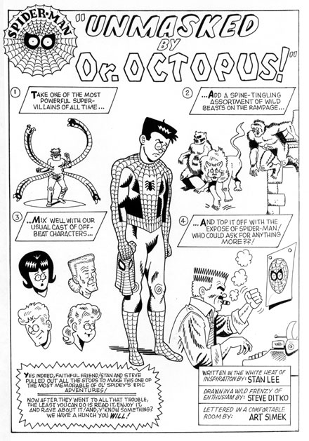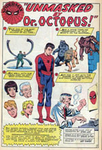 THIS time, he does it by the numbers! Dr. Octopus! Lions, gorillas, and bears (Oh my!)! Aunt May, Flash Thompson, Liz Allan, and, debuting her brand-new hairstyle (bringing her look all the way up to, oh, I don't know--the early fifties, perhaps?...), Betty Brant! And madly pounding out words of hate aimed towards the unappreciated adventurer, the cigar-chomping J. Jonah Jameson! Standing in the middle of it all, head hung 'neath a revealing (if ultimately misleading) Artie Simek inscribed title blurb is poor ol' Petey himself! Wow! Take one quick glance at THIS numerical chart, and then just try NOT to read the story herein!! I assure you, in back in 1964, it plainly could not be done! (But I've just gotta wonder--exactly how much typing can a person actually accomplish using but one hand to dance antically across the keyboard while the other is utilized primarily as a fist to shake at the target of one's venomous vitriol, as our good pal Jameson is depicted herein? Or perhaps I'm reading too much into the symbology of the drawing, y'know? Because then my next two question would have to concern the new-found ability of our simian brothers to walk down the side of city buildings in an upright position--and to inquire as to exactly WHEN Spidey's amiable associates became disembodied heads, floating freely in space?...) (But then, that would be extremely silly, wouldn't it?,,,) |