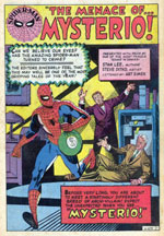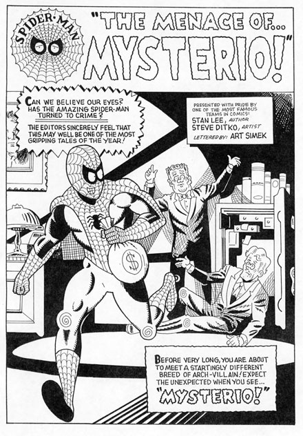 on this sensational splash page! Fact is, as much as I go on and on about the unquestioned architects of the Marvel Age of Comics--Lee, Ditko, and Kirby--the contribution letterer Simek (and second in command, Sam Rosen, as well) made to the look and feel of those early books is far from negligible. Just look at how deftly the name "Mysterio" is swaddled in atmosphere under Artie's legendary lettering pens! Calligraphically speaking, the guy was my all-time favorite, and the reason shouldn't be much of a (ahem...) mystery to anyone with eyes as to just exactly why! Oh, and incidentally, that particular first page is NOT merely a symbolic introductory illustration like those often found in many a Ditko's story. The very next page finds our false fugitive Webhead successfully fleeing the law through the canyons of the big city, a series of actions that grow organically right out of our scene-setting splash. True, we never again glimpse the two webbed-up bank officials, but one can only assume they eventually managed to free themselves, and gotten back to the important business of giving out toasters to new customers and foreclosing on old ones, particularly little old ladies and starving orphans! (Care for some toast, junior?...) |