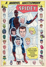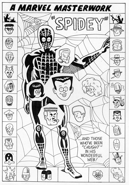 ya! The webbing, the all-inclusive nature of the villains cameo boxes, the civilian associates, the pensive body pose, and oh my gosh, the tremendously effective lighting playing across the webspinner's frame--MAGNIFICENT, just flat out magnificent... You can well imagine the sheer fan-boy pleasure I felt from redoing this delightful Ditko design!! I tried my best to do the source material justice, and you can judge for yourself whether I came anywhere close to succeeding. I hope so for, as, like Stan's adroit copy puts it, I too have long been one of many "caught in his wonderful web!" |