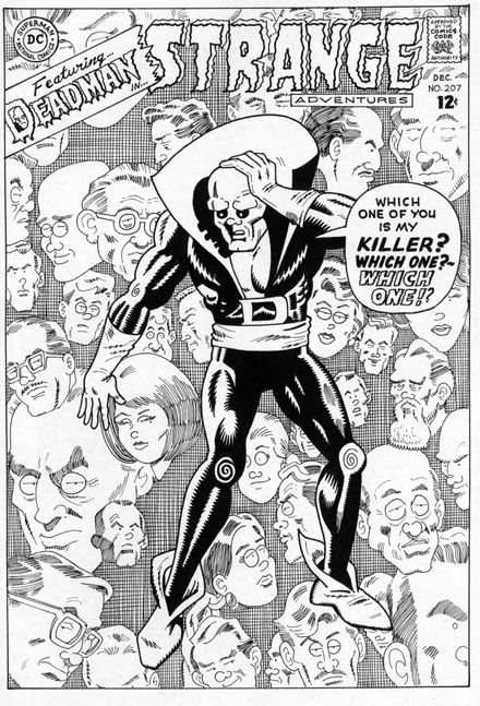 Time Forgot... Let's talk about ME for a minute, shall we? After all, can't have enough of THAT here at Hembeck.com, now can we? Aping this illustration presented several unique problems. On Neal's original, he no doubt inked the foreground figure of Deadman and the background heads of his co-workers with the same black ink. However, one of those very production demons pictured (and to paraphrase Boston Brand, "Which one?--WHICH ONE!?") opted to print the entire group in a massive light green drop-out, so that they--and not only some of the fellas hairlines--would recede from prominence! A masterful touch, but without the use of color, how ever was I going to approximate the effect? Simple. I used a substantially thinner pen line than the one employed on the distressed deceased. And not to toot my own horn--because, frankly, I don't OWN a horn--but I was always pretty happy about the way this one came out. But before I get too carried away with my own self, credit where credit is due--DAZZLING drawing, Mr. A!! Thanks for letting me borrow it for a bit!! (Oh, and in an ironic twist of fate, Deadman's killer was indeed amongst those pictured on this cover! He may not've been the Hook character as per the series storyline, but when publisher Carmine Infantino gave the circus corpse HIS hook, it was time to bury the big-top's busiest stiff once and for all!! Them's the breaks.) |