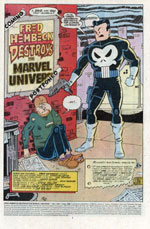 Simple-we reduce the book from 48 pages to the more standard 32, cut out the framing sequence and just keep the blood, gore and gags (actually, there was no actual blood and gore, but you get what I'm saying). By utilizing the inside front and back covers, that left us 7 pages to devise an entirely NEW framing sequence, one depicting yours truly down on his luck, haunting back alleys, and being grilled mercilessly by the Punisher (a VERY hot item at the time) as to the story behind this by now somewhat mythical destruction of the Marvel Universe book. I allude to as many of the old jokes as I can salvage, add a few new twists, and voila! | |