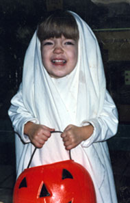 "BOO!!" That was the line I cleverly taught 3 year-old Julie to say when we went door-to-door the night of her very first Trick Or Treating expedition some eleven Halloweens back. Okay, Arthur Miller I'm not, but c'mon--some situations just cry out for cliches, y'know? |