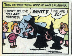 | But don't take my word for it, at least not entirely. As my own special Halloween gift to you, I've scanned in one very special story for your reading enjoyment. There were, obviously, so many delightful entries to pick from, and while I would've loved to have chosen one featuring the whole gang, any one of that sort that I considered somehow seemed to be diminished without being able to include the accompanying stories that surrounded it. Finally, then, I decided it would be best to share one of Lulu's many Alvin-placating tales with you, though not one with the Hazel and her niece, Itch. No, this particular story--called "Good Night, Alvin!"--instead stars a thinly veiled version of the pesky redhead himself in place of the witch duo. | |