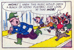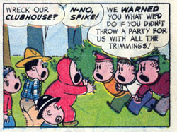 | How can I help but not smile thinking about the school truant officer, the aptly named Mr. McNabbem, dressing up as the Pied Piper in the ultimately vain hopes of corralling a passel of wayward students? Or Tubby's desperate and always demeaning attempts to appease the West Side Boys, a group of hardened bullies who demand from him a specially prepared Halloween feast in the Gang's precious clubhouse under the threat of it's imminent destruction should he not come up with a menu to their liking? | |