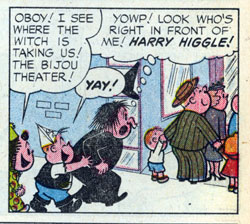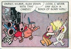 | Then there was rotten rich kid Wilbur's lavish party--with just a touch of unwelcome sadism thrown in on the part of the host towards his reluctant guests? Or Tubby and smaller, identical cousin Chubby, causing farcical confusion to a hapless costume store salesman, who can't help but think the two are one and the same due to some well-timed wandering in and out of the panels by the pair, having no choice but to wonder just why his potential customer seems to keep changing sizes each and every time he brings out an outfit for him (them?) to try on? | |