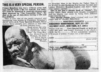 October 31st, 2003 Happy Halloween! As I mentioned previously, I've been watching some vintage horror movies from the thirties and forties on the Turner Classic Movies channel, all in my never-ending effort to get in the proper mood for the season. Mostly, I've been taking in flicks I've never seen before, but am nonetheless inordinately familiar with due to reading and re-reading my monster magazine collection over the decades, amassed mostly in the mid-sixties when a lot of these films--save for the more popular "Frankenstein" and "Dracula" entries--were rarely, if ever, broadcast over the then-severely limited airwaves. While I've become accustomed to recognizing a key shot from a long-ago ingrained still photo--such as Peter Lorre wearing dark glasses, an elaborate neck brace, and fake mechanical hands near the conclusion of "Mad Love"--I wasn't at all prepared for what greeted me when I sat down and watched Tod Browning's classic "Freaks" last night!! This unique look into the bizarre world of circus sideshows was legendary for using actual, authentic performers to populate it's decidedly peculiar cast. I'd always found this particular notion to be at once intriguing AND off-putting. I was never one to take in these sort of exhibits when I'd, on occasion, visit a carnival, and in fact, generally went out of my way to avoid them entirely. Similarly, I'd kept a wide berth of this 1932 MGM production the few times in the past when the rare opportunity to view it presented itself to me. But last night I figured, what the heck--it's supposed to be a pretty good movie, after all--why not watch it? So I did. And it WAS good, treating it's subject matter with a great deal of understanding and respect. And the climactic finale, wherein the so-called freaks take rightful vengeance on their tormentors, is indeed powerful stuff. But that's not what prompted me to write this piece. This fellow here is... |
