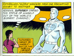 kreation several decades earlier. And just what would Mort have his mighty champion DO with his mighty powers? Well, how about seek out the world's biggest diamond--JUST SO THAT HE COULD CARVE A STATUE OF HIMSELF OUT OF IT!?! Forget about the world's biggest diamond--apparently, we're dealing with the world's biggest EGO here!?! I mean, is this really the BEST way to utilize this incredibly enormous gem?? I wouldn't think so, and neither, it would seem, did any of his comics biz contemporaries... Julie Schwartz had the citizens of Central City erect a Flash Museum for their hometown hero, but the speedster wisely left the establishment's acquisitions to the duly elected board and not to some way-out whims of his own. And Stan Lee? Well, his Fantastic Four had to wait until they hooked up with the blind step-daughter of one of their arch-est of enemies before they found someone interested in sculpting their likenesses. And as for Spider-Man? We all know how J. Jonah Jameson's Daily Bugle treated the Web-spinner, don't we? Spidey was hardly considered a diamond of ANY sort by the sour newspaper publisher, although when it came to "World's Biggest", JJJ may've had some thoughts on THAT, though I'd prefer not to print the less-than-complimentary categories he no doubt considered here. Use your imagination, true believers... My point is, it's absolutely ridiculous to think a true-blue hero like Superboy would ever indulge in such an excessive act of self-promotion as Mort had pictured in this perverse little panel. A super-villain might do something like this, you bet--but a good guy? Uh uh. Hard to swallow that notion coming from the white hats. I mean, try and think about this in real life terms. Maybe some megalomaniacal dictator would fashion a massive statue of this sort as a misguided tribute to himself, but certainly not someone who works for the betterment of mankind. Nope. No way. |