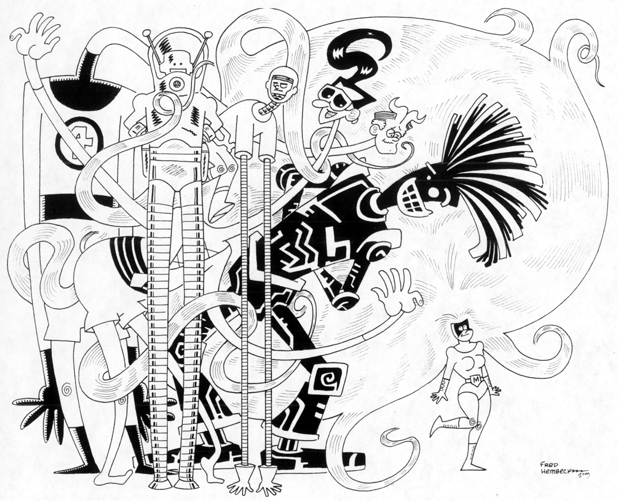 | I was given the task via a recent commission to draw several stretching or otherwise malleable characters--Mr. Fantastic, Plastic Man, Daredevil's antagonist Stilt-Man, Jack Kirby's Machine Man, Warlock of The New Mutants, and The Inhumans' Medusa--in whatever sort of group scenario I pleased. This was the result. What a fun bunch, don'tcha think? |