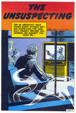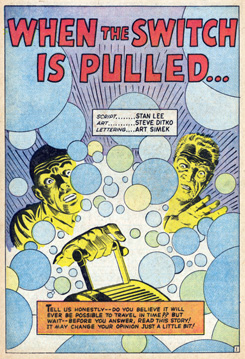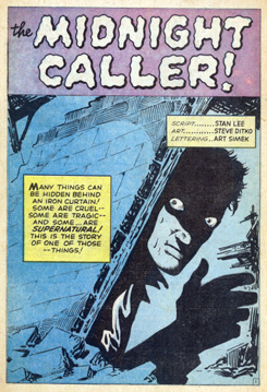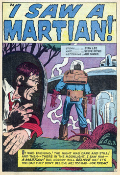 | I was there practically from the beginning. Having bought the fourth issue of THE FANTASTIC FOUR off the stands on a cold wintery day in early 1962, I was there almost from the outset of the Marvel Revolution of Comics. I came in on Thor shortly after he rediscovered his Uru hammer, mere months after Bruce Banner was first bathed in gamma radiation, right after Tony Stark's heart suffered a shrapnel wound to the heart in Viet Nam. But as one era beckoned, another, vastly under appreciated, began to wind down inexorably: the era of the Lee/Ditko weirdies. By 1962, these five page twist ending tales, written by Stan Lee and drawn by Steve Ditko (and generally lettered and colored by Artie Simek and Stan Goldberg, respectively), had proudly taken the back-up slot in virtually every issue of Atlas publication's small but memorable line of fantasy titles for several years, the perfect cerebral counterpoint to the more sinew-driven monster epics flowing endlessly out of the magical lead pencil of Jack Kirby, whose pocket-sized epics that were invariably the meat-and-potatoes cover story of any given issue. The King regularly served up the main course, but Stan and Steve provided for an always tasty dessert. |